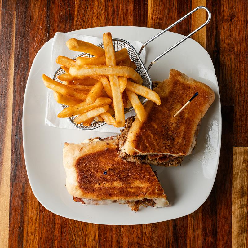 Slow-roasted mojo-marinated pork, ham, applewood smoked bacon, pickles, honey Dijon mustard, Swiss cheese, garlic aioli on a hoagie then pressed, and grilled Cuban-style.