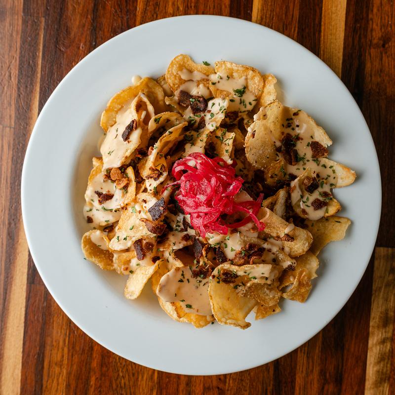 Our pub chips tossed in garlic parmesan seasoning topped with beer cheese, bacon, and pickled red onions.