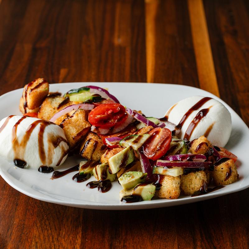 Lightly marinated tomato, red onion, cucumber and avocado with toasted bread, and burrata cheese finished with balsamic glaze.