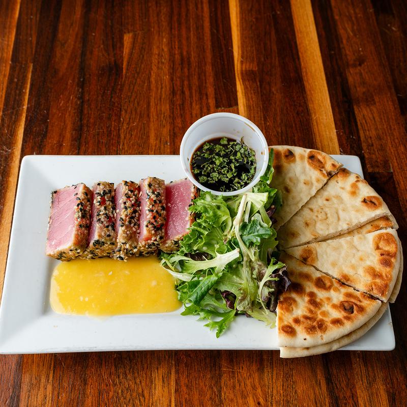 Tuna Ahi Saku encrusted with sesame-wasabi crust served with pita, mixed greens, and house-made ponzu sauce.