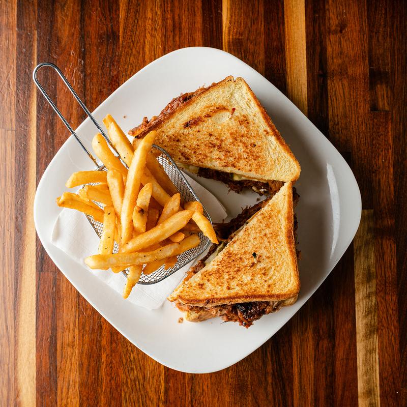 Slow-roasted pork with BBQ sauce on Texas toast with slaw, pickles, and cheddar cheese | Add bacon +$2.00